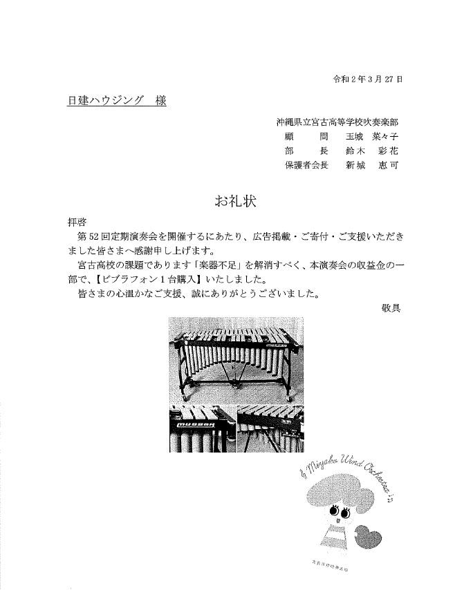 宮古高等学校吹奏楽部より寄付金の御礼状が届きました