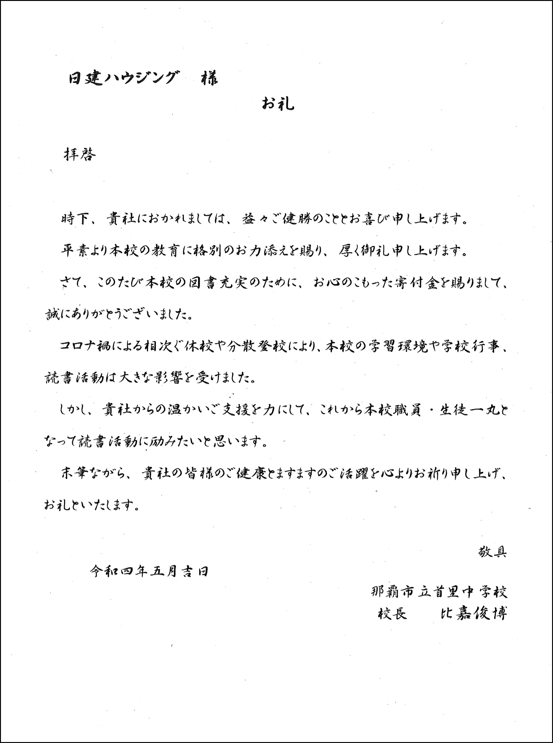 首里中学校より、図書費寄贈のお礼状が届きました