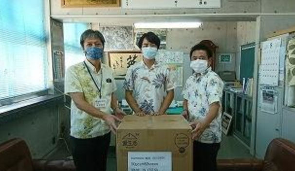 当日は、代表取締役社長の眞保栄秀一様、不動産事業部部長の山城洋之様が来校し、段ボール箱5箱分のマスクを直接いただきました。